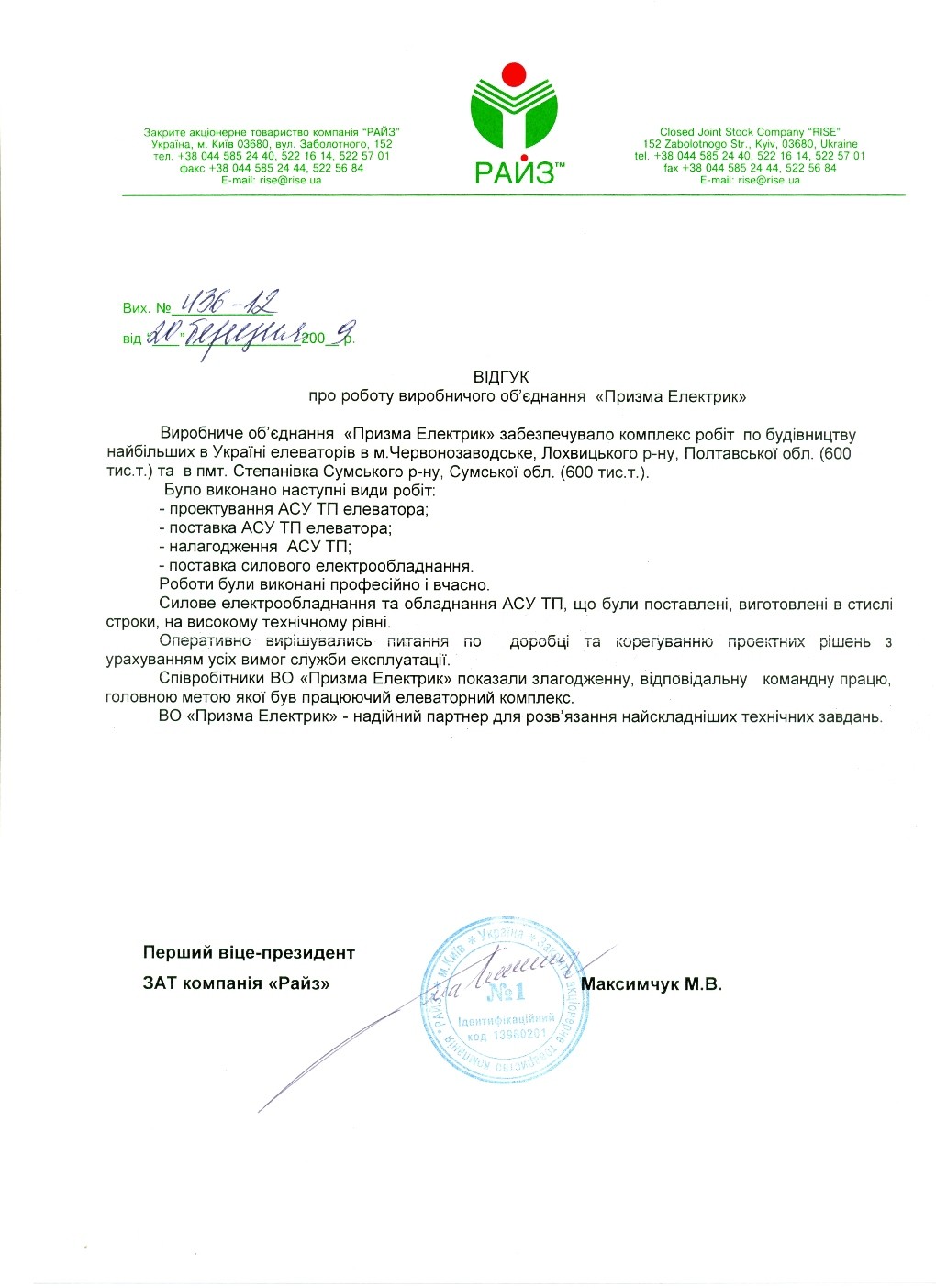 Відгук ЗАТ компанія «Райз» про роботу «Призма Електрик»